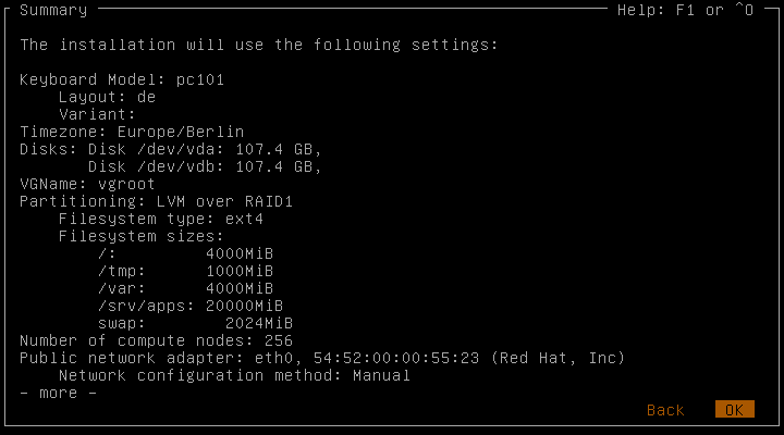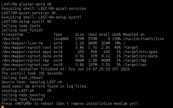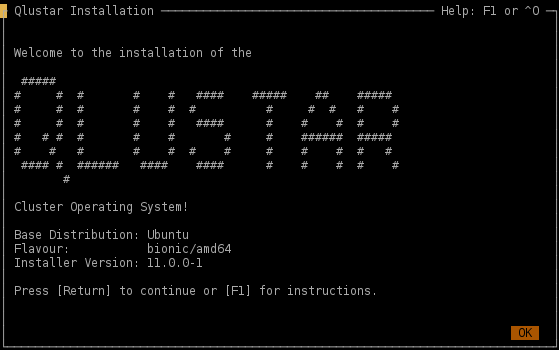 Now compare the such-generated checksum with the value that is published at the above download page. If the checksums are not identical, do not proceed with the installation, since that means the installer is corrupt (either due to hardware errors or a malicious attack). In this case, you should download the image once more. If the problem persists, also after downloading from a different computer, please post the incidence in the Qlustar Mailing List.0 user@workstation ~ $sha256sum qlustar-installer.iso