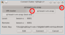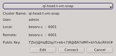 Connect Cluster dialog opens. The last cluster used will be pre-selected but a different cluster can be selected from the drop-down menu. Click the button to connect to the selected cluster. If this is the first time you connect to this cluster, the client generates a random public/private key pair. These keys will eventually be used for permanent authentification of the chosen user with this cluster. Following this, a connection to the server is made with an attempt to authenticate the client using the one-time token. On success, the server stores the public key of the client for future logins and the client stores both the private and public keys in the certificate safe. This finalizes the initial handshake.