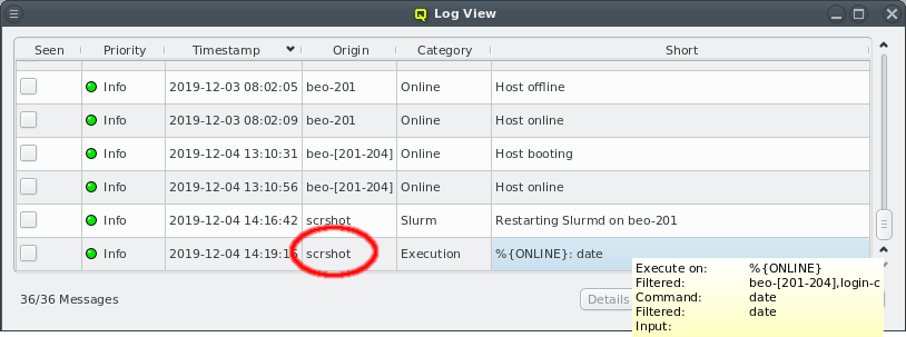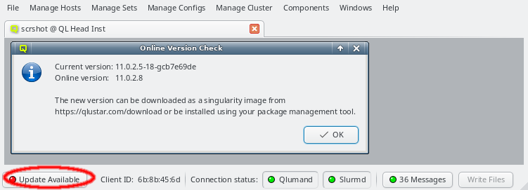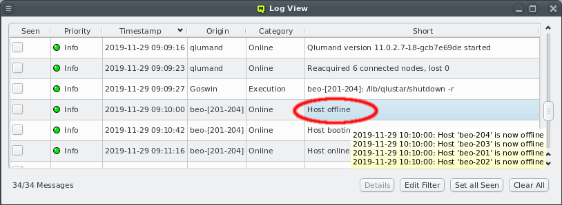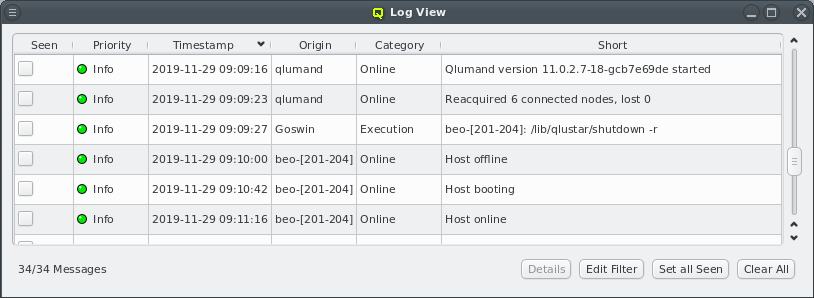 Online have been dramatically reduced in number. For example when restarting Qlumand, the messages originating from individual hosts when reconnecting have been suppressed. Instead, after a short time, a single message is now added showing a summary of all nodes that have reconnected or failed to do so within a given time interval. The full list of nodes can then be seen in the tool-tip or by clicking the button.