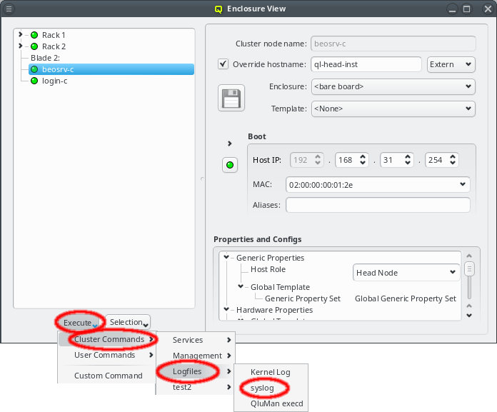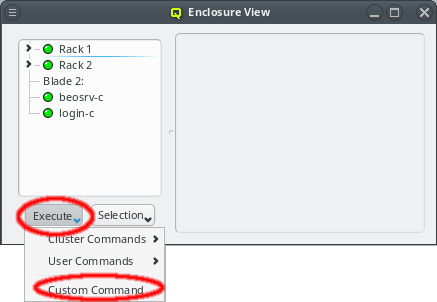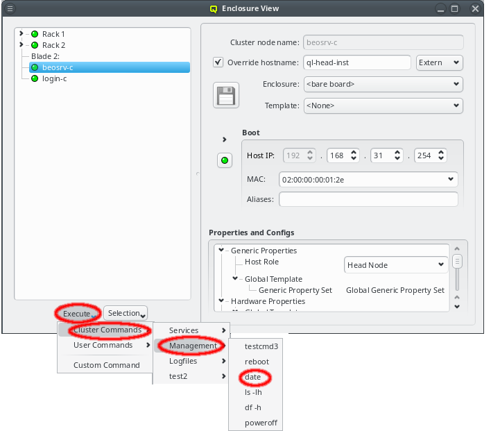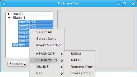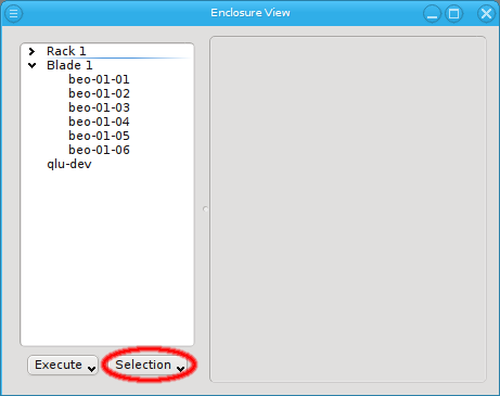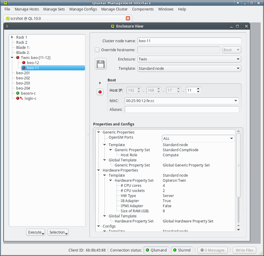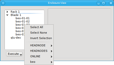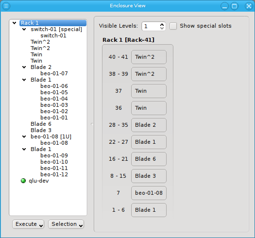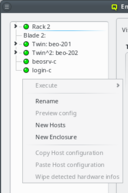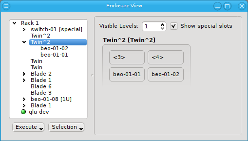 Enclosure View shows an overview of the cluster in a tree structure. The tree is designed to reflect the physical structure of the cluster. At the lowest level are the hosts. A host can be a head, storage or compute node but also a switch e.g. In general, anything in the cluster that has a name, IP and MAC address is a host.