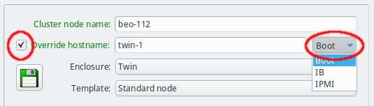 Cluster node name will always resolve to its IP in the boot network. It is also used as the stem, when the name of the host in networks slaved to the boot network is generated with the configured pre-/suffix of the slave. E.g. per default, the name in the IPMI network has a suffix of ipmi, which means that a host with Cluster node name beo-01 will become beo-01-ipmi in the IPMI network.