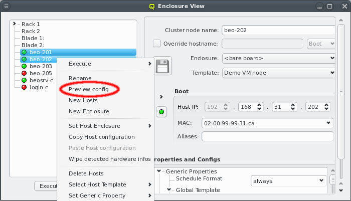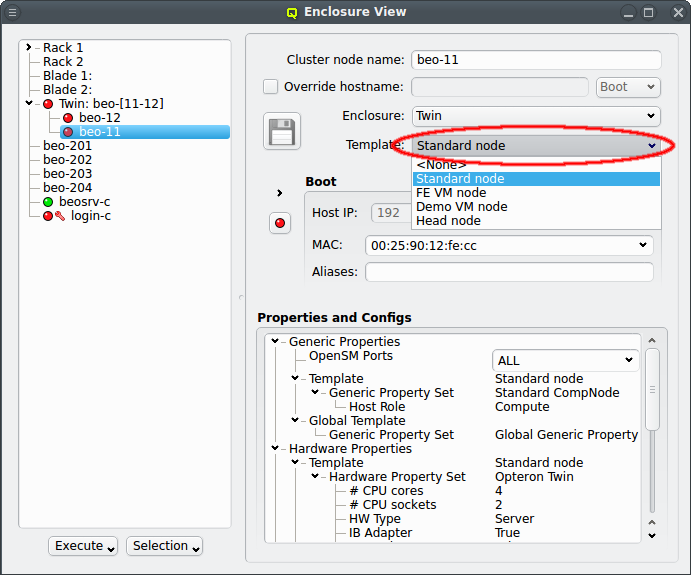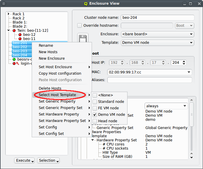 Host Template. When a correct Host Template exists, a host can be configured by selecting the desired template in the Enclosure View window. For a single host, this can be done by selecting it in the tree view. This brings up the host information on the right and a template can be selected from the drop-down menu. To configure multiple hosts, you would select them in the tree view and choose a Host Template from the context menu. The check-marks in the sub-menu indicate which Host Templates are currently assigned (if any) for the selected nodes. This action will override the previous assignment for all selected hosts.