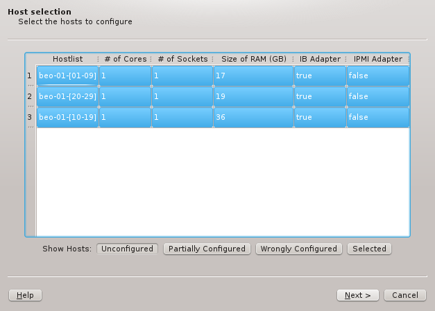Host Template and therefore single Hardware Property, Generic Property and Config Set. The possible differences in hardware configurations within the list of selected hosts will be handled by the wizard with the per host settings. In case all the groups shouldn't use the same Host Template, groups may be selected or deselected individually and the remaining ones can be configured by running the wizard again later. Groups of hosts with identical hardware can't be split up though. If this is required, select the hosts individually in the Enclosure View and use only the button. Once the desired groups of hosts have been selected click to continue configuring them.