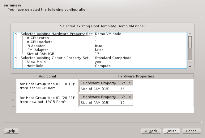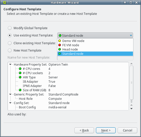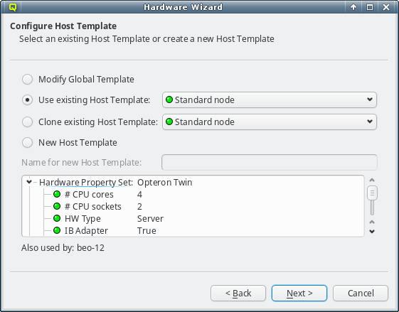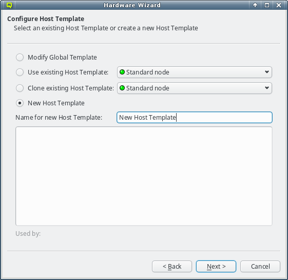 Host Template. One of the wizard's goals is, to find an existing Host Template with a Hardware Property set that optimally matches the detected hardware for at least some of the selected hosts. If such a Host Template is found, it will be pre-selected and the choice will be active.