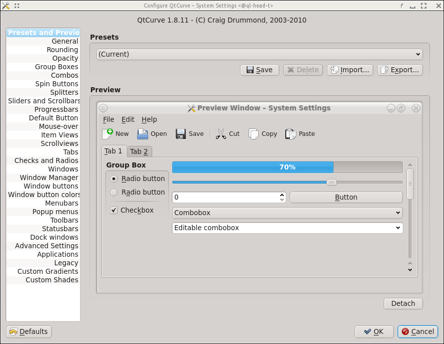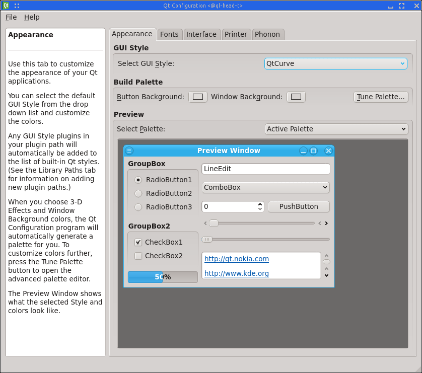 Application Appearance dialog (see above), click on the Style icon, choose the style you've selected in qtconfig as Widget style and press the button. You'll then see a large number of options for