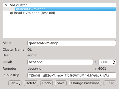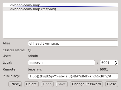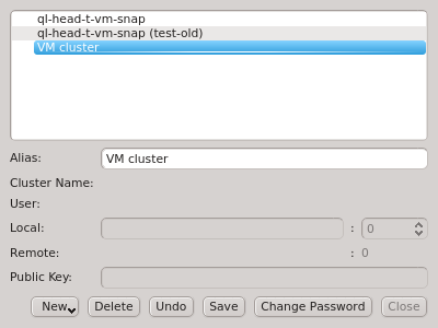 Manage Clusters dialog manages all your accounts on different clusters or as different users on the same cluster. It allows adding new cluster connections, editing existing and removing obsolete ones as well as changing the password for the certificate safe. It can be opened by clicking in the Connect Cluster dialog.