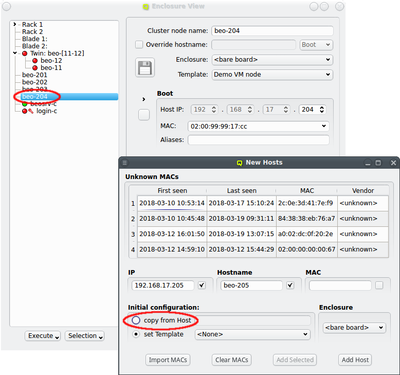 Host Template will fall into this category. The button adds hosts that already have some hardware configured correctly but not all of it. The button adds hosts, where the configured hardware properties do not match the hardware detected at boot, e.g. when nodes have been updated with more ram. Finally, the button adds hosts, that have been selected in the enclosure view, including hosts that are configured correctly already.