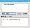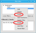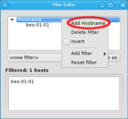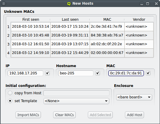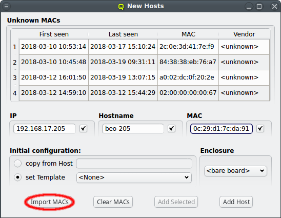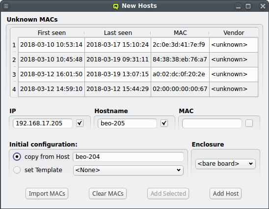 DHCP log file for unknown hosts that have requested an IP address. For each unknown host found in the logs, the table at the top of the window shows the time of the first and last appearance in the log, its MAC address as well as the hardware vendor this MAC is assigned too (if known). Selecting a MAC in the table copies it into the MAC text field at the bottom and a double-click adds the host with the selected MAC. One can also select multiple lines (by holding the CTRL key and clicking or holding the shift key and dragging the mouse) and then click the button at the bottom to add them all using the auto-increment feature for the IP address and hostname. If unsure, try adding a single host first and check the auto-increment does the right thing before adding a group of hosts.