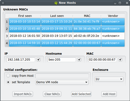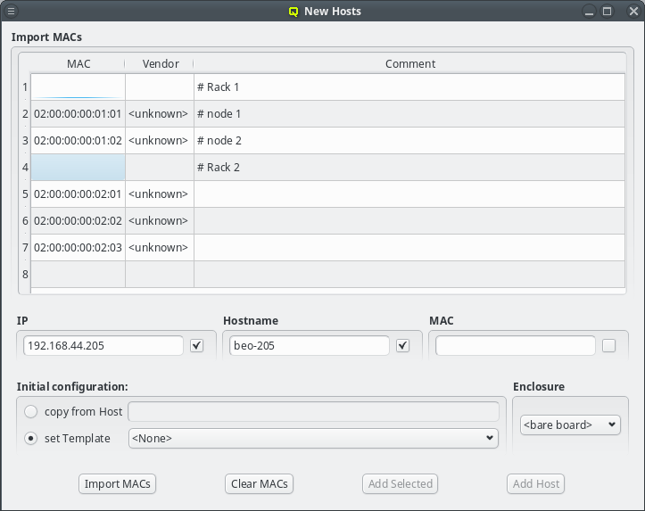 # Rack 1 02:00:00:00:01:01 # node 1 02:00:00:00:01:02 # node 2 # Rack 2 02:00:00:00:02:01 02:00:00:00:02:02 02:00:00:00:02:03In case the file can not be parsed an error is shown with the line number at which parsing failed. Otherwise the MAC addresses will be shown in place of the unassigned MAC addresses detected by the DHCP server. Adding single hosts or groups of host from the list works the same way as with the detected MACs as described above. Clicking the button clears the imported MACs and returns to the list of MACs detected by the DHCP server.