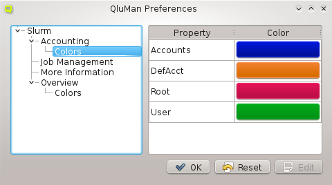 Slurm instance. To better distinguish between accounts and users, they are identified by pre-defined color codes (See Preferences Dialog for changing the corresponding colors). At the bottom of the dialog you can see a legend for the color codes.