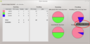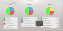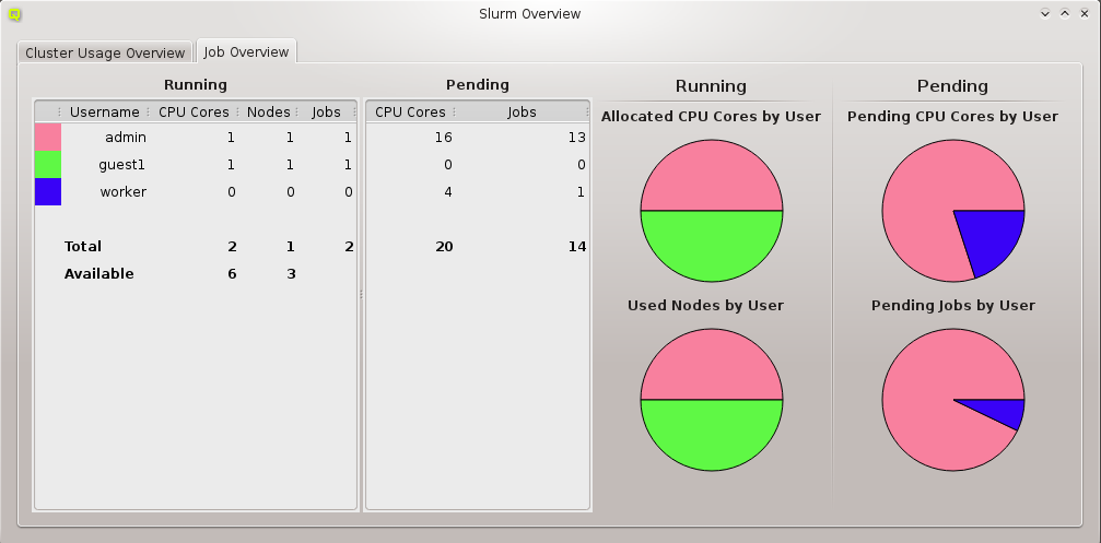 Job Overview display consists of two tables and four charts being continuously updated. The Running table provides summary information about running jobs of users. It shows the color representing the user (if his share is displayed in one of the charts), his username, the count of utilized CPU cores, the number of used nodes and the number of running jobs. The Pending table provides the total number of requested CPU cores and the number of pending jobs for the same user.