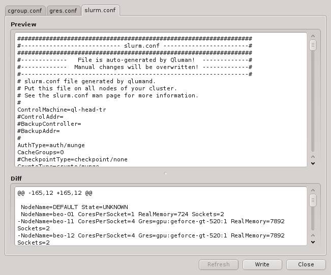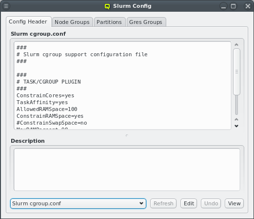 cgroups.conf. On write, QluMan adds the NodeName and PartitionName lines at the end of the slurm config template to generate the slurm.conf file, while the cgroup.conf file gets written as is. For the syntax of both templates, please refer to the slurm documentation (e.g. man slurm.conf). To edit one of the templates, select it, click the button and start making changes. Click to save the changes or to discard them. Use the button to check changes before writing them.