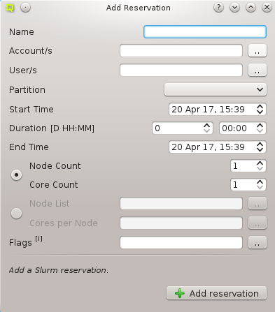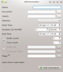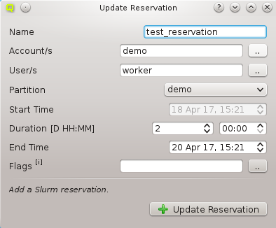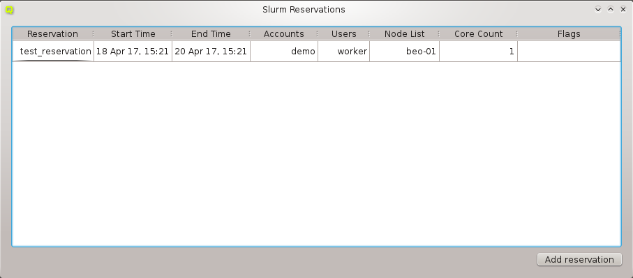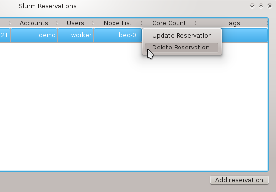 Slurm Reservations window shows a table of all active reservations and their most important properties. Furthermore, it allows to manipulate the reservations and create new ones.