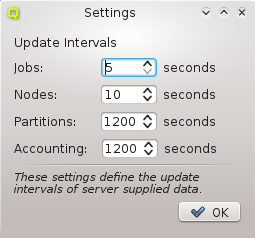 QluMan Slurm Settings dialog allows to customize the update intervals for information about jobs, nodes, partitions and Slurm accounting. This information flow is provided by the QluMan Slurm daemon running on the cluster and the QluMan GUI automatically subscribes to it. Shorter update intervals mean more server load and more network traffic. In most cases, the default values should be adequate.