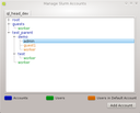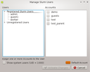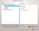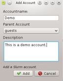 Manage Slurm Accounts dialog go . There will be a tab for every cluster known to the Slurm accounting database. Each tab contains a tree with the accounts and users that are registered in the corresponding