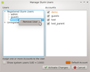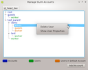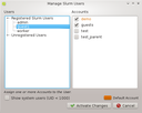 Manage Users dialog allows to assign accounts to a user, set and change a user's default account, register new users and delete users. When a user is selected, the accounts he is a member of are checked in the Accounts list displayed at the right. His default account is highlighted with the specific color set for default accounts in the Preferences Dialog. By default, system users are hidden. To show them, just check the Show system users (UID < 1000) checkbox.