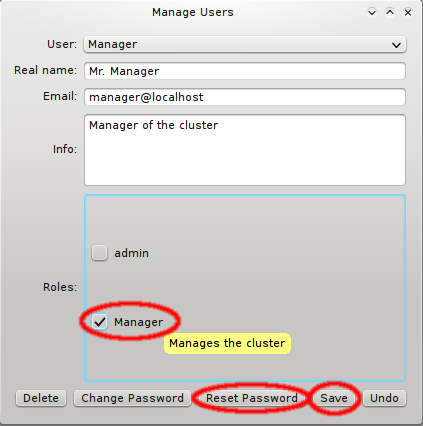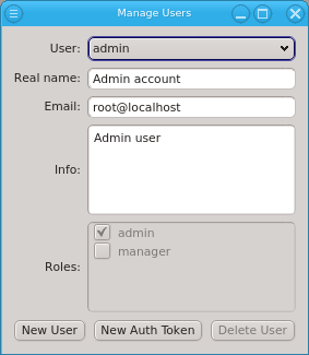 admin user is pre-defined and has the admin role, meaning all possible rights. Roles for the admin user can not be changed, just like the root user in a Linux system always has all rights. When running QluMan for the first time, you should set the correct email address for the admin user.