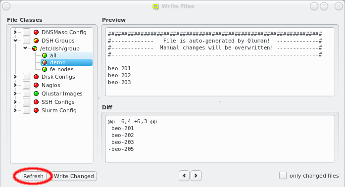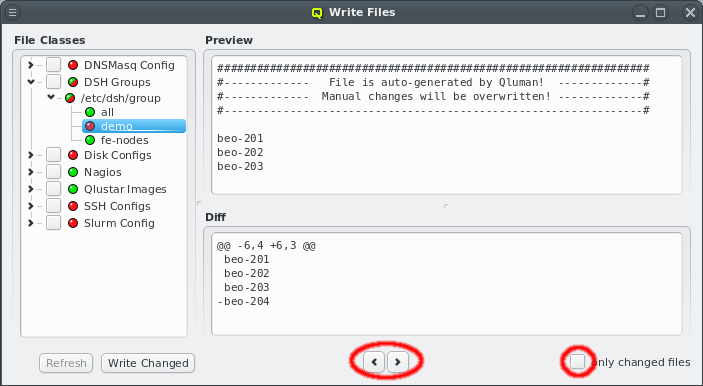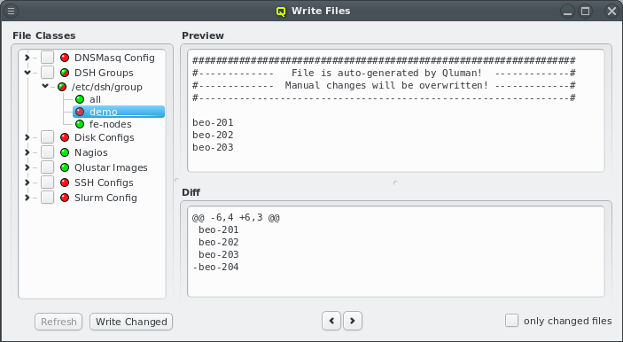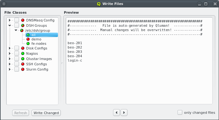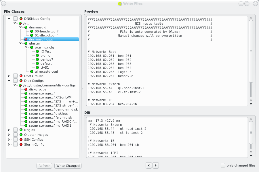 dnsmasq Config must be written from the Write Files window (see Section 7.2, “Writing Config Files”). This will reconfigure and restart the dnsmasq server so the new settings take effect. However this will only affect the DNS part of the change. If hostnames used for Filesystem Exports definitions are involved, a host that uses the corresponding mounts will see the change only the next time it boots.